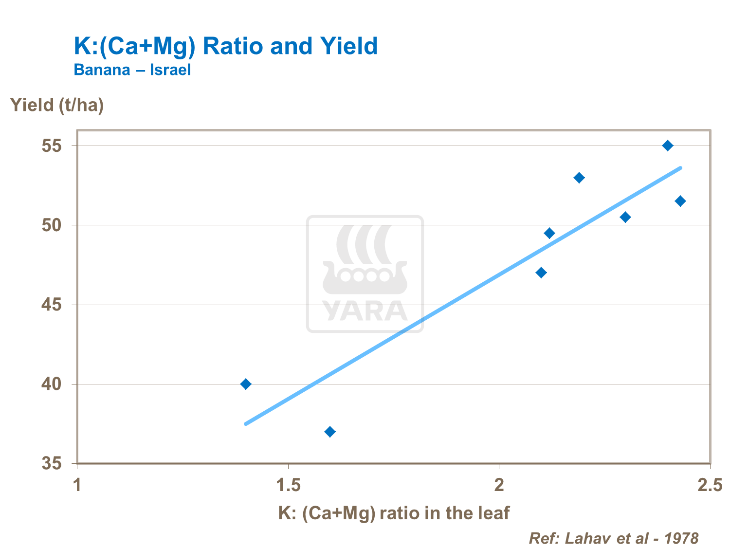 Trials suggest the balance in leaves between potassium, magnesium and calcium is important for banana yield.