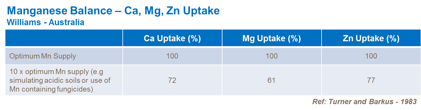 Manganese is essential for respiration, N metabolism and chlorophyll synthesis boosting yield and plant growth Acid soils may have relatively high levels of manganese. In these situations the manganese can compete with and restrict the uptake of other nutrients. Where manganese toxicity is a problem, leaf concentrations may reach 6000 ppm, with the result that the 'green life' of fruit is reduced, contributing to the disorder known as 'mixed ripe'.