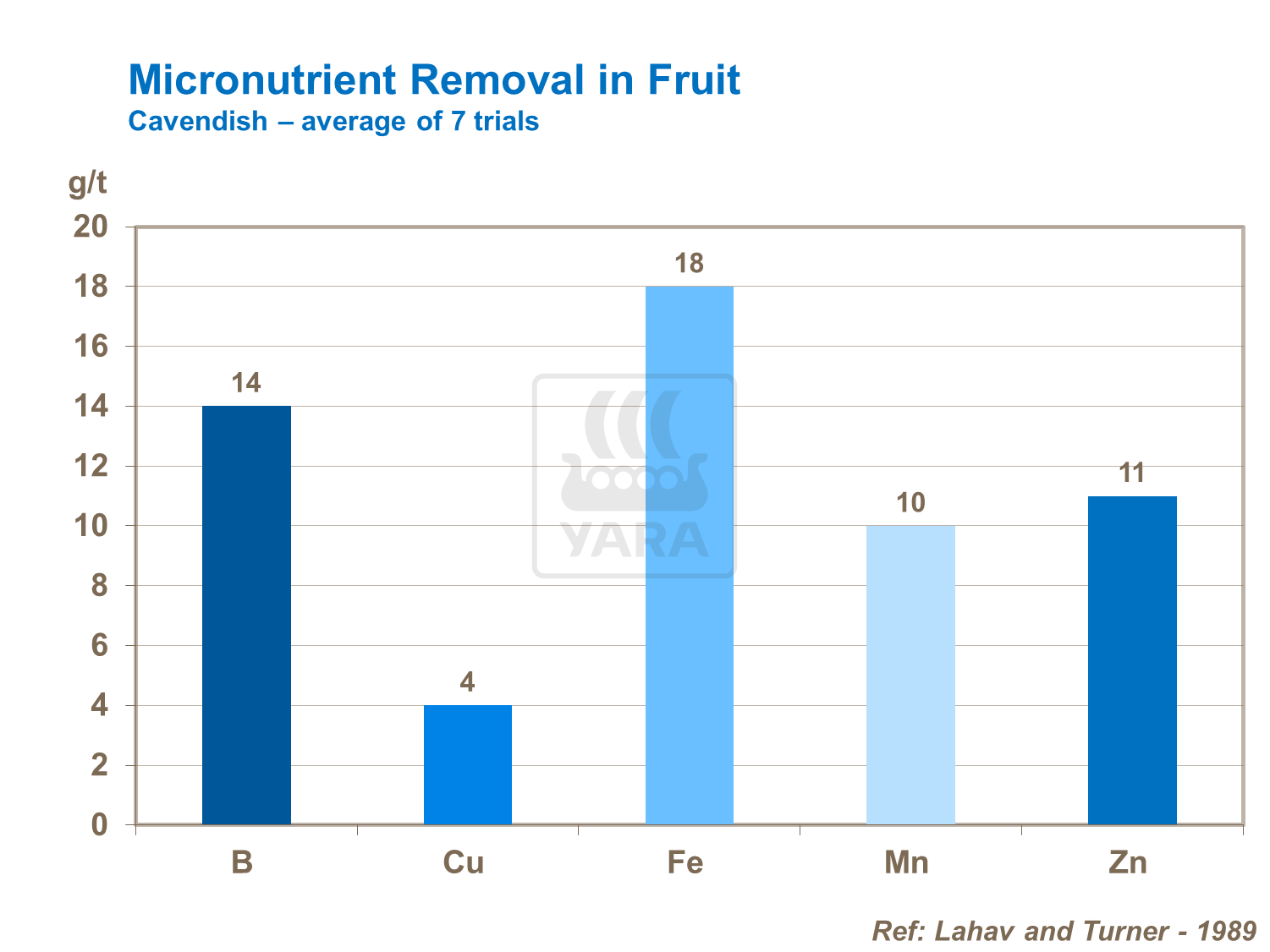 Phosphorous needs are small, generally less than 1kg/t of plant and fruit in Cavendish bananas. The crop requires a constant supply throughout the growth period.