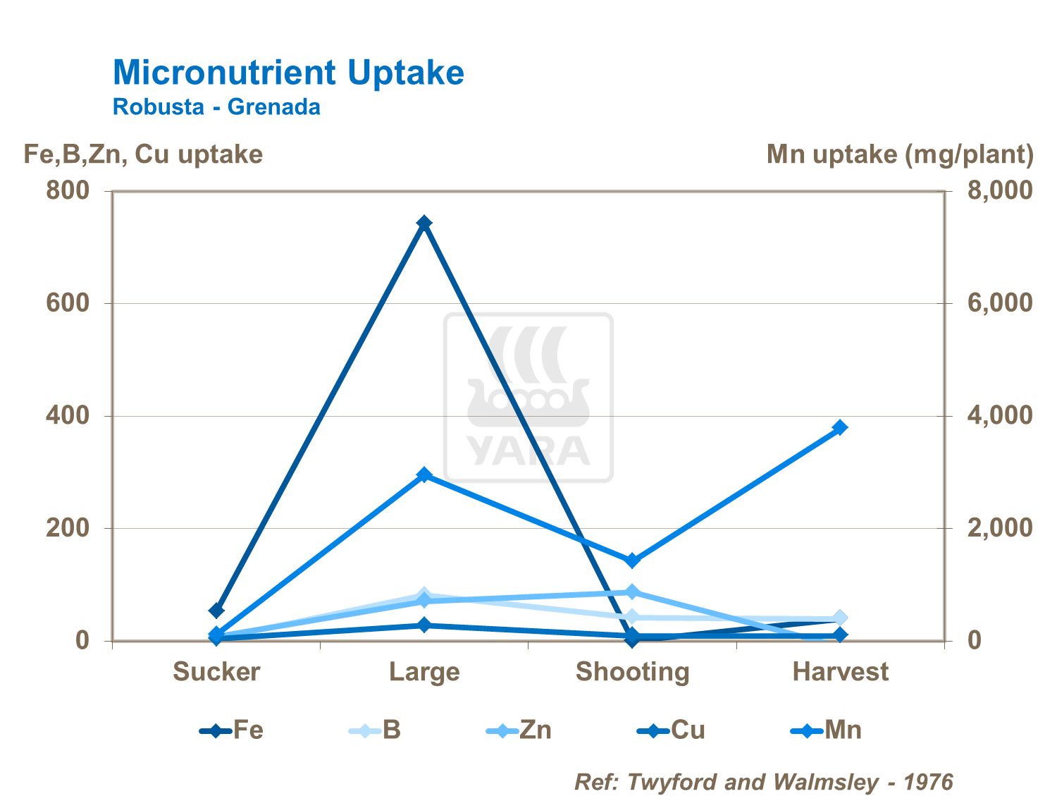 The most rapid uptake of sulfur occurs from the sucker to shooting stage and the plant utilizes around 1kg/t of plant and fruit.