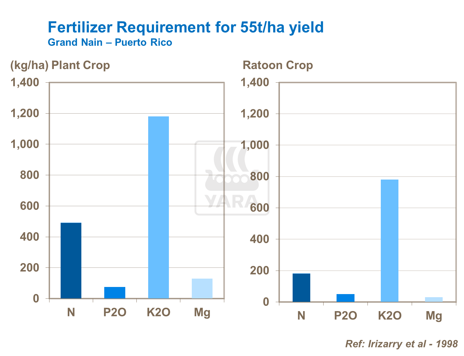 Uptake of potassium can be more than the total of all other nutrients combined and between 3-4 times higher than the amount of nitrogen needed. Peak demand is around flowering. Research shows that the majority of the crop’s total potassium needs should be applied before peak flowering. Both plant and ratoon crops utilize similar amounts of potassium during the season, with removal of around 5-7kg/t of fruit.