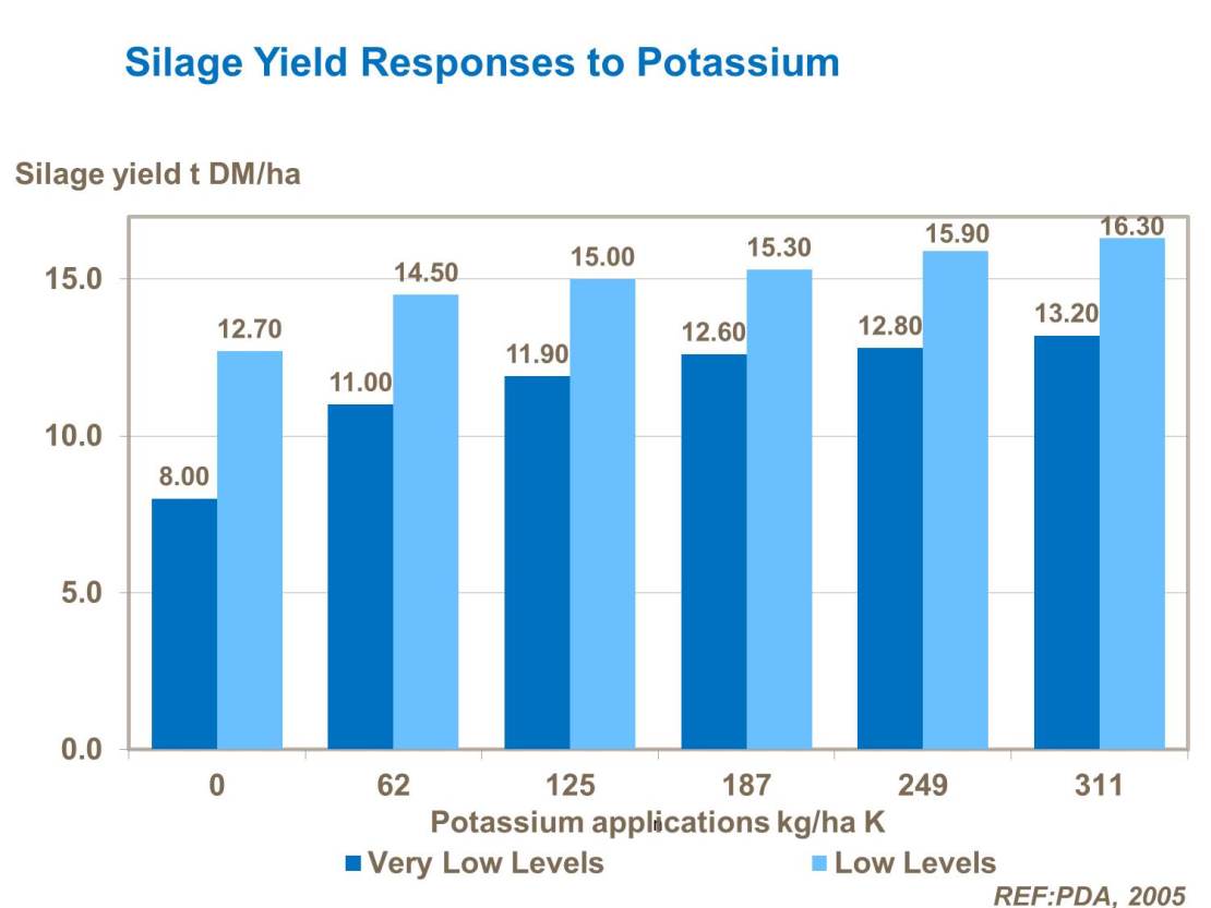 Potassium has a wide ranging role in the plant affecting nutrient uptake, photosynthesis, rate of growth and feed value.