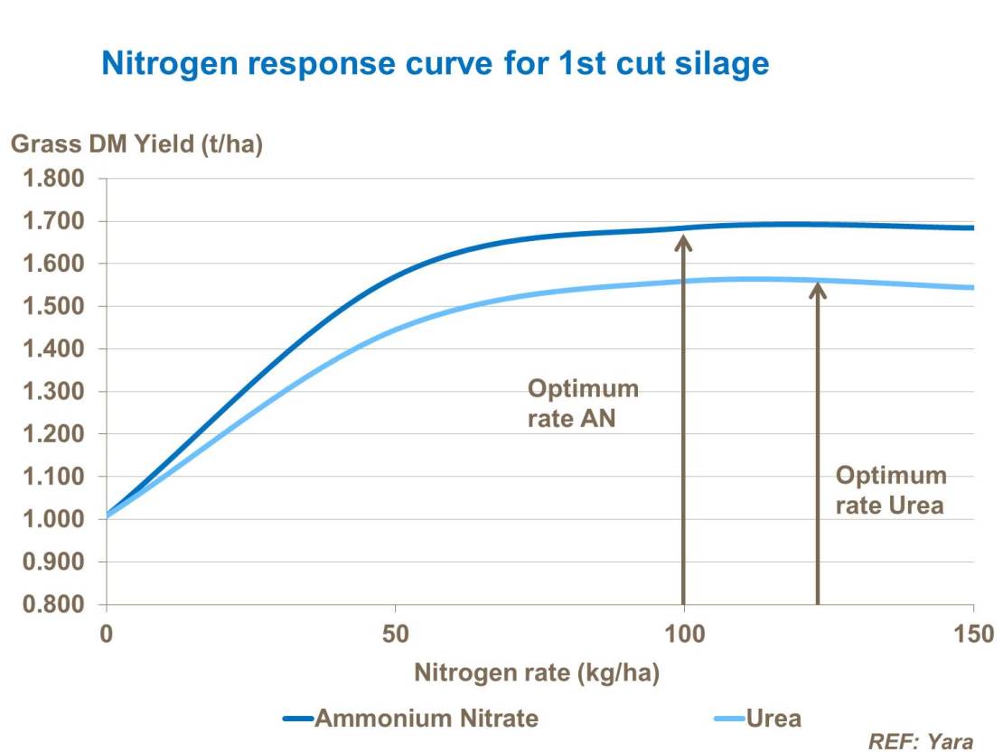 This chart shows the typical nitrogen response from applications of AN or Urea based on Yara trials conducted over many years. The actual optimum will tend to vary depending on site location and grass growth potential.