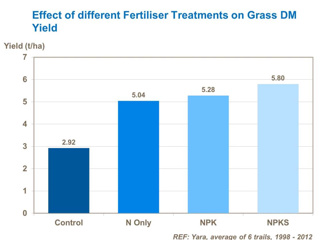 Sulphur is essential in the formation of protein and so is crucial for growth and development. As grass grows both sulphur and nitrogen are used together so sulphur deficiency will decrease nitrogen use efficiency and so reduce yield. Historically sulphur was supplied by atmospheric deposition however as a result of reduced industrial emissions and improved air quality this has become much lower in recent years so increased responses to sulphur is now seen in grass and other crops.