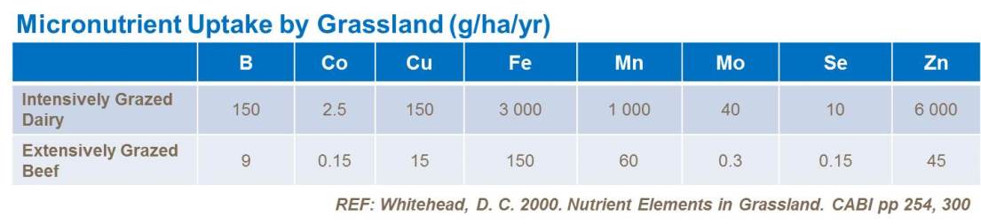 Other micronutrients which are not essential for grass but are required by grazing animals include sodium and selenium and also copper and zinc are required in higher levels in animals than are required for grass growth.