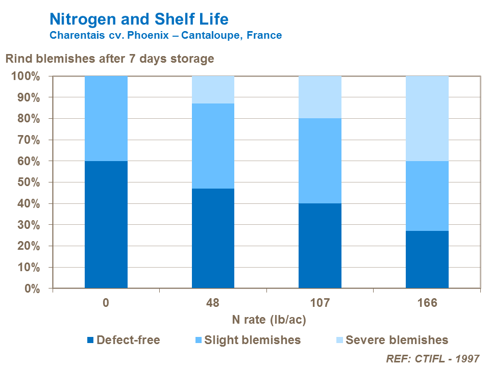 Too much nitrogen at later stages of growth can spoil fruit quality by increasing the level of blemish on the rind and encouraging fruit rot. Thus, it is important to confirm rates and timing following local trials that take into account the need for high yield, but also good quality fruit.