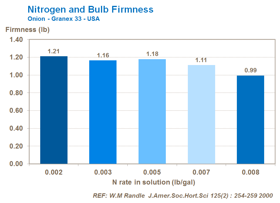 Nitrogen can help to increase the specific weight of the outer skin, which results in an improvement of the bulb’s resistance to pressure, therefore reducing handling and storage damages. However, overall bulb firmness may decrease with high rates of nitrogen due to a softening of internal tissue.