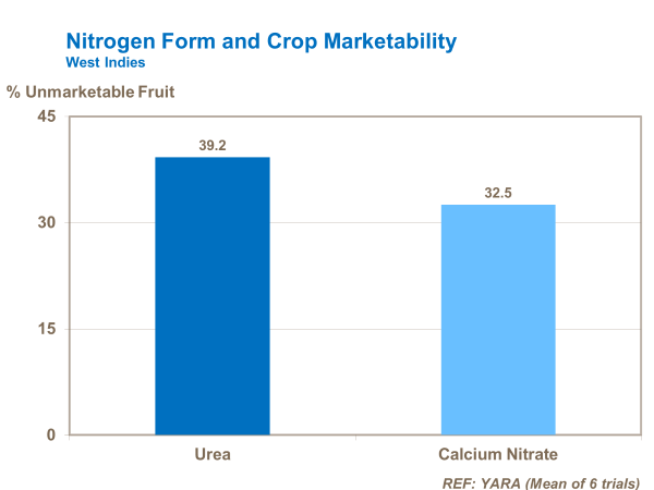 Tomato quality and the shelf life suffer as a result of using excessive ammonium forms of nitrogen. Fruit is firmer and more marketable where nitrate forms (calcium nitrate, potassium nitrate) are used.