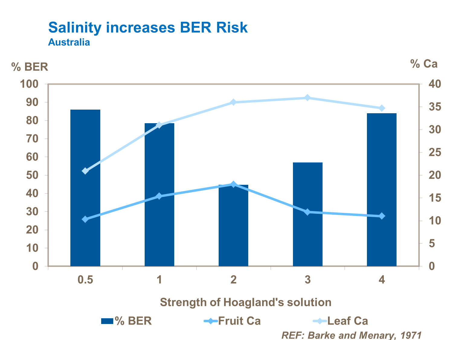 - Salinity restricts calcium uptake, thereby increasing the risks of BER (Figure 37). This as a result of greater competition from other cations and increased use of calcium for leaf and xylem development rather than fruit accumulation.