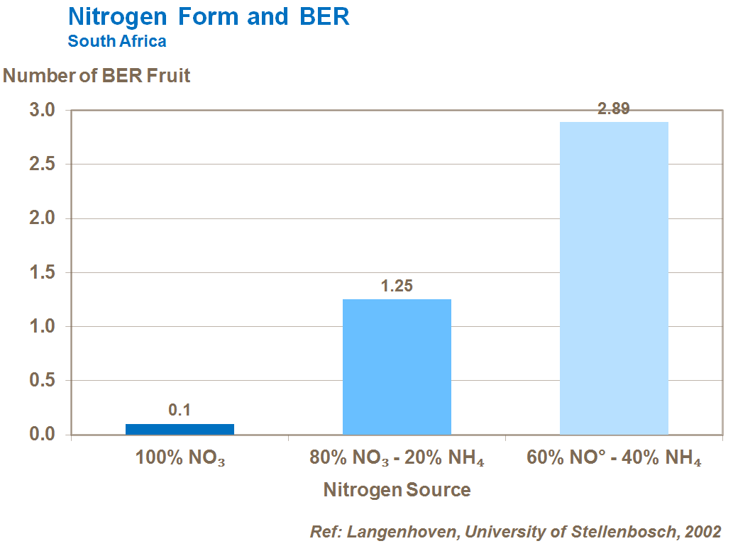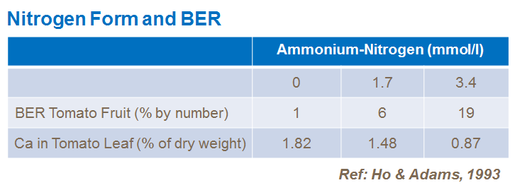 Over use of N-ammonium will prevent tomato from uptaking other important nutrients like calcium; in this situation the risk of BER increases. Problems are worse when ammonium is used after fruit set and when crops are under moisture stress.