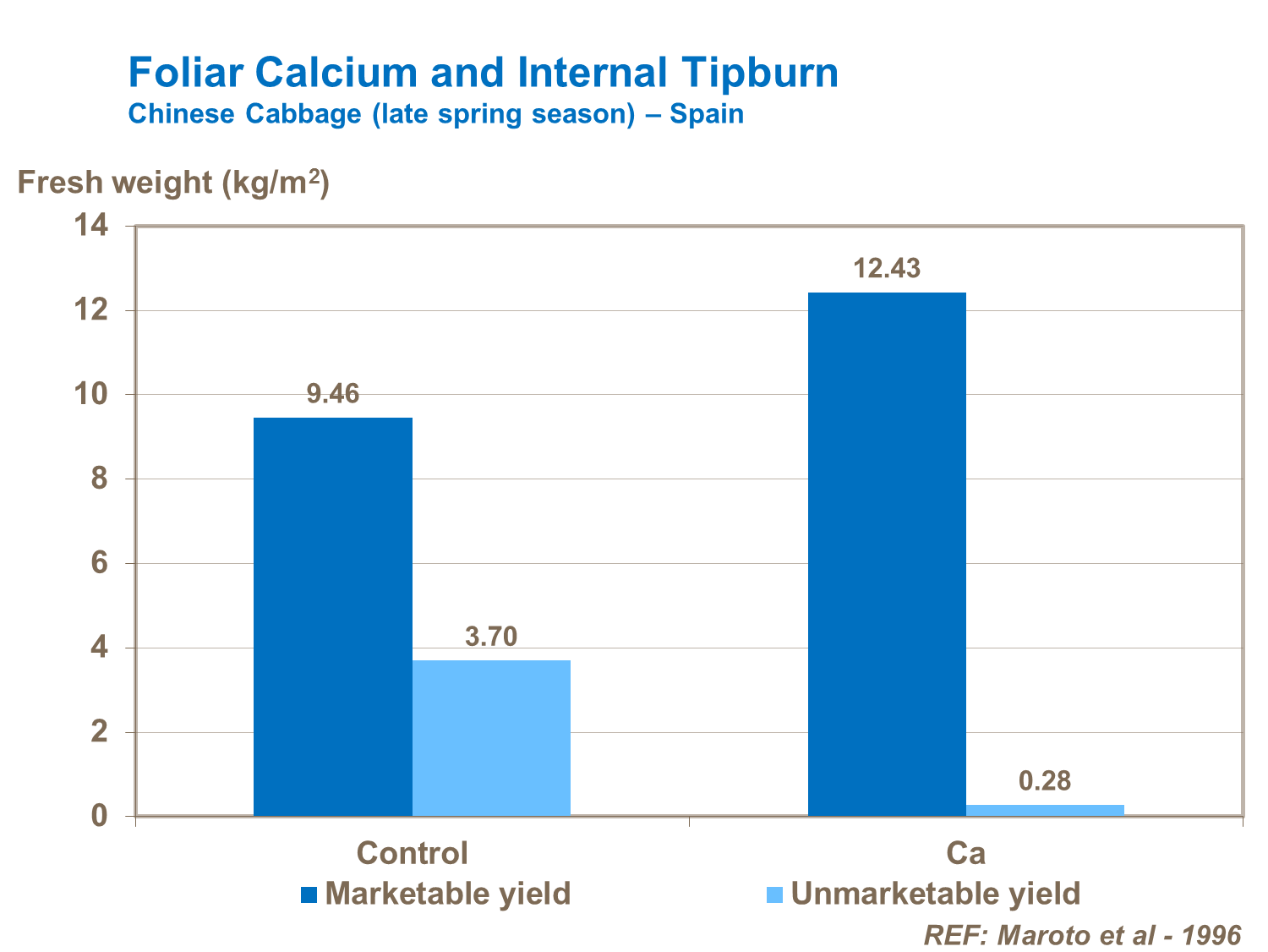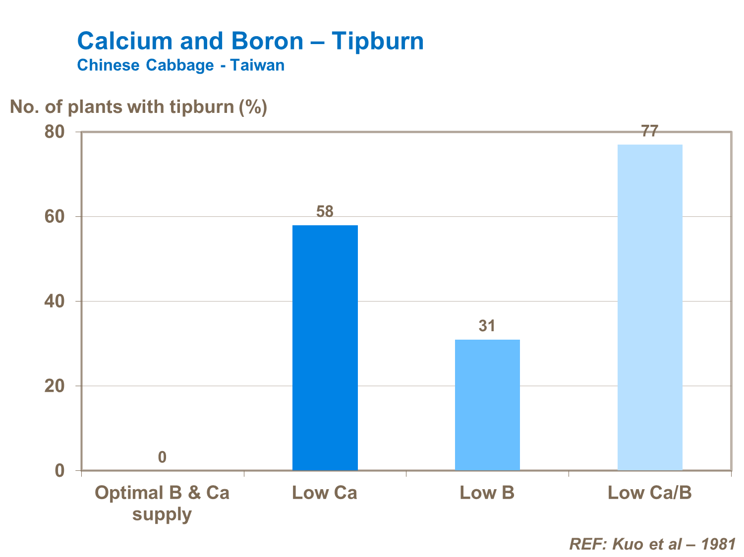 Tipburn is related to calcium and/or boron deficiency. This deficiency can be as a result of a shortage of supply, or induced by factors such as poor water management, imbalanced nutrition and restricted root growth. Air humidity has a strong impact on tipburn as both calcium and boron uptake and distribution inside the plant is affected by transpiration. Uptake of these nutrients is enhanced by low air humidity resulting in a high transpiration, but, the internal transport of calcium and B to the low transpiring tissues inside the head is promoted in a humid atmosphere.